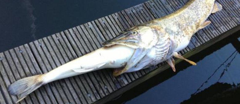 Um peixe foi encontrado morto em um rio em Almere, na Holanda, com a comida ainda na boca.